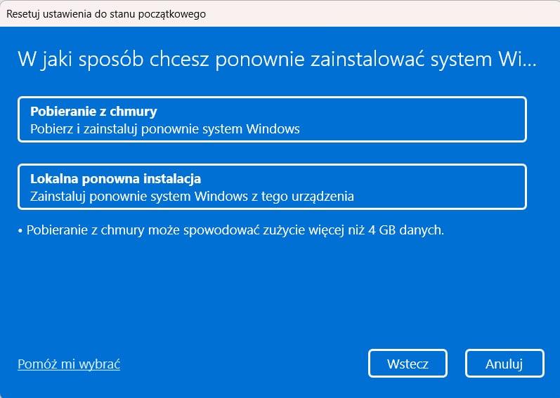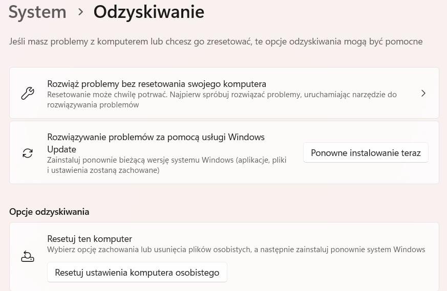 ⚠️ Uwaga: ten krok może wymagać uprawnień administratora. Na laptopie firmowym opcja resetu może być zablokowana przez polityki IT.