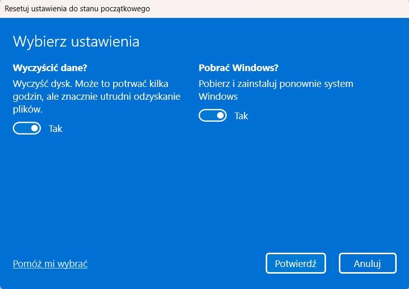 Zresetuj system z opcjami: „Usuń wszystko” oraz „Czyszczenie danych”